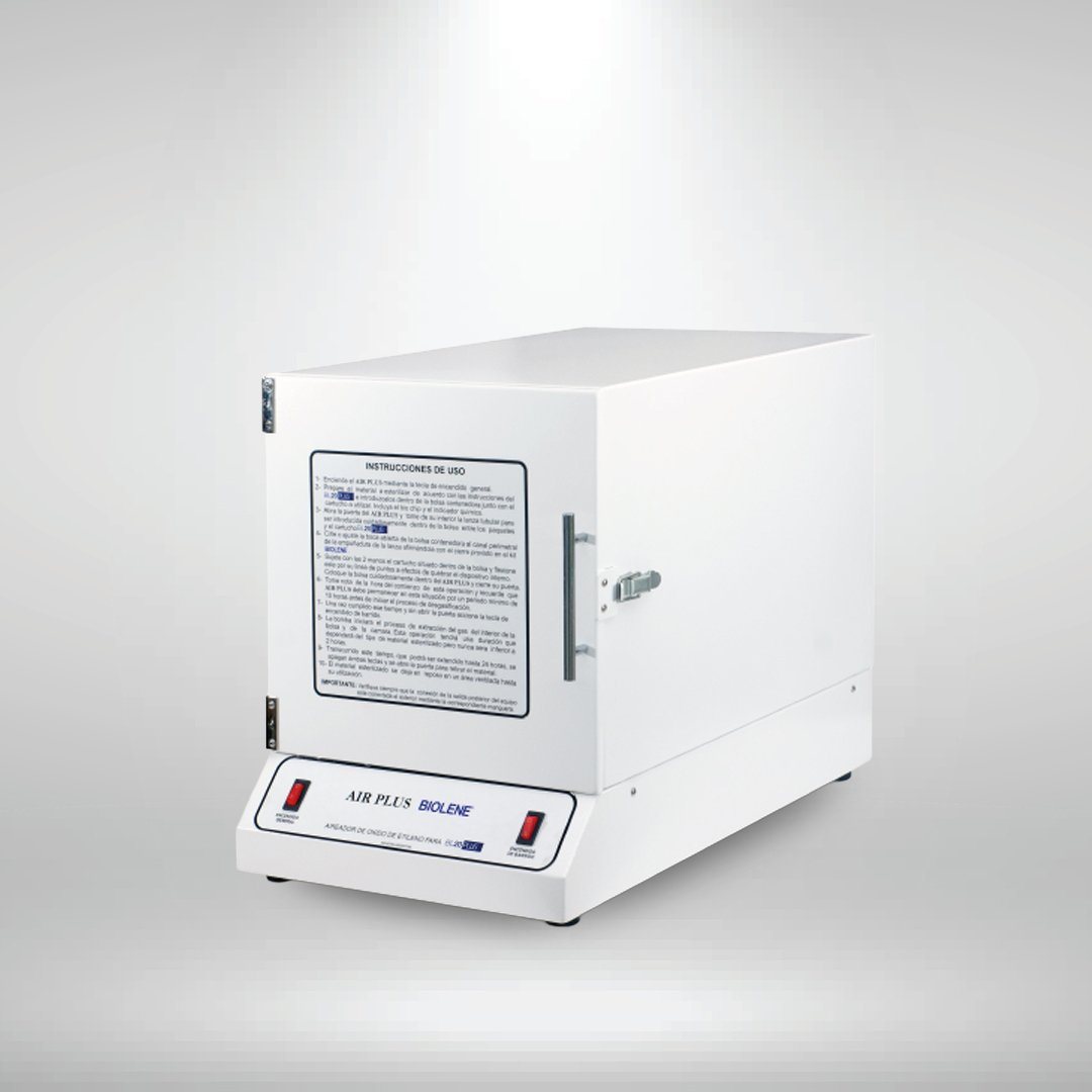 BIOLENE SRL pone a su disposición el AIR-PLUS, equipo aireador donde, en forma segura y a bajo costo, se realizan en forma manual procesos de esterilización por óxido de etileno, utilizando para ello el kit de esterilización BL20 Plus. Así, de esta manera, sólo se utilizan 17.6 gr de ETO por carga.